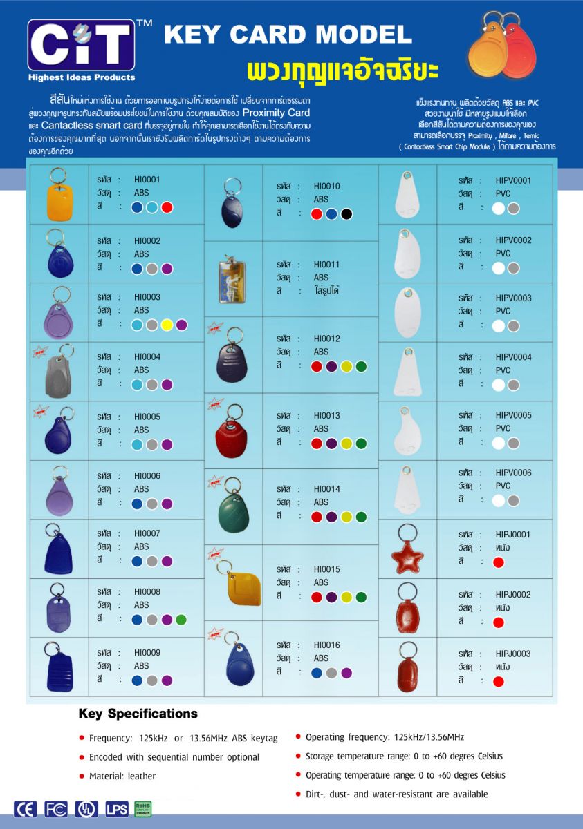 พวกกุญแจอัจฉริยะ สีสันใหม่แห่งการใช้งาน ด้วยการออกแบบรูปทรงให้ง่ายต่อการใช้งาน เปลี่ยนจากการ์ดธรรมดาสู่พวงกุญแจรูปทรงทัน สมัยพร้อมประโยชน์ในการใช้งาน ด้วยคุณสมบัติของ Proximity Card และ Contactless smart card ที่บรรจุอยู่ภายใน ทำให้คุณสามารถเลือกใช้ งานได้จริงกับความต้องการของคุณมากที่สุด นอกจากนั้นยังรับผลิตการ์ดในรูปทรงต่างๆ ตามความต้องการของคุณอีกด้วย แข็งแรงทนทาน ผลิตด้วยวัสดุ ABS และ PVC สวยงามน่าใช้ มีหลายรูปแบบให้เลือก เลือกสีสันได้ตามความต้องการ ของคุณเอง สามารถเลือกบรรจุ Proximity , Mifare , Temic (Contactless Smart Chip Module) ได้ตามความต้องการ