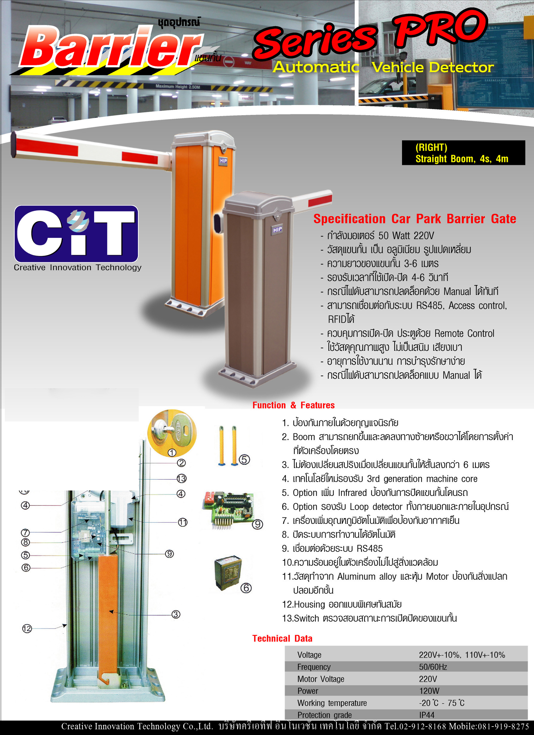 สามารถเชื่อมต่อกับระบบเครื่องทาบบัตรระยะใกล้-ไกลได้ ความยาวของแขนกั้น 3-6 เมตร รองรับเวลาที่ใช้เปิด-ปิด 4 วินาที รองรับการเปิด-ปิด 100,000ครั้ง อายุการใช้งานนาน การบำรุงรักษาง่าย