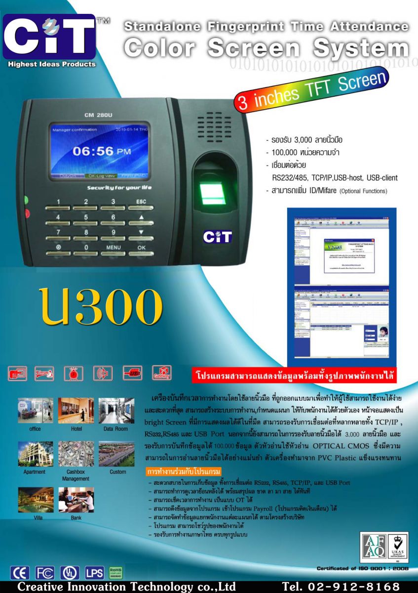 เป็นเครื่องบันทึกเวลาด้วยลายนิ้วมือ แบบ Standalone ใช้งานง่าย พร้อมโชว์รูปพนักงานยืนยันตัวตน รองรับ3,000 ลายนิ้วมือ บันทึกได้ถึง100,000 รายการ หัวอ่านกระจกทนต่อแรงขีดข่วน พร้อมเสียงภาษาไทย